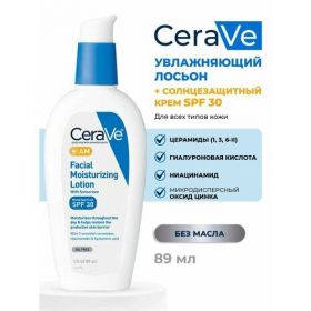 - Увлажняющий крем для лица CeraVe AM - это многофункциональное средство для утреннего ухода за кожей, которое увлажняет и питает вашу кожу, помогая поглощать и отражать вредные UVA- и UVB-лучи солнца. В его состав входят три незаменимых керамида, а также увлажняющая гиалуроновая кислота, успокаивающий ниацинамид, технология InVisibleZinc (мелкодисперсный оксид цинка) и наша технология MVE, которая обеспечивает постоянный поток увлажняющих ингредиентов для непрерывного увлажнения в течение всего дня. Наш увлажняющий крем с солнцезащитным кремом SPF 30 обеспечивает как химическую, так и минеральную защиту от солнца, легко и равномерно распределяется и разработан таким образом, чтобы поддерживать защитный барьер кожи. Эта формула легкая и не комедогенная (то есть не закупоривает поры), что делает ее идеальным выбором для всех типов кожи.