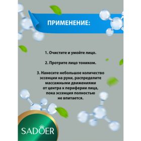Увлажняющая эссенция для лица Sadoer с гиалуроновой кислотой 10 гр. х 4 шт. Действие эссенции с гиалуроновой кислотой направлено на увлажнение и омоложение кожи. Средство имеет нежный аромат и легкую текстуру, благодаря чему применение эссенции будет приятным и комфортным. Эссенцию следует использовать в комплексе с другими ухаживающими средствами. Продукт наносят на предварительно очищенную и тонизированную кожу, перед применением крема или геля для лица. Гиалуроновая кислота в составе средства интенсивно насыщает клетки кожи влагой, запечатывая воду в клетках и не давая ей испариться. Благодаря этому кожа напитывается влагой изнутри. Устраняется проблема обезвоживания и высыхания кожи, исчезают шелушения и стянутость. Кожа становится ухоженной, сияющей и здоровой. Гиалуроновая кислота оказывает мощное омолаживающее действие, проникая и заполняя морщины, разглаживая их. Предупреждает процессы старения и увядания кожи, приводя кожу в тонус и запуская ускоренную регенерацию клеток. Способ применения: 1. Очистите и умойте лицо. 2. Протрите лицо тоником. 3. Нанесите небольшое количество эссенции на руки, распределите массажными движениями от центра к периферии лица, пока эссенция не впитается в кожу лица.
