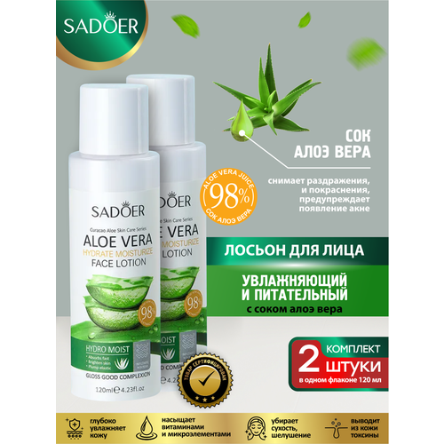 Увлажняющий и питательный лосьон для лица Sadoer с соком алоэ вера 120 мл. х 2 шт. Лосьон для лица с легкой текстурой и нежным травяным ароматом имеет общеукрепляющее и восстанавливающее действие, увлажняет кожу и насыщает ее витаминами и необходимыми микроэлементами.