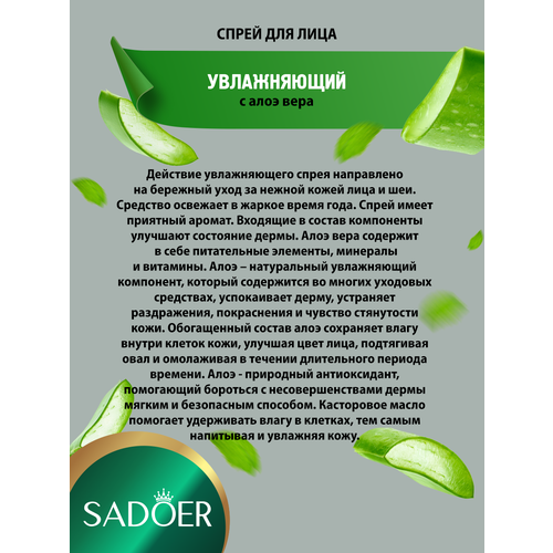 Увлажняющий спрей для лица Sadoer с соком алоэ вера 100 мл. х 3 шт. Действие увлажняющего спрея направлено на бережный уход за нежной кожей лица и шеи. Средство освежает в жаркое время года. Спрей имеет приятный аромат. Входящие в состав компоненты улучшают состояние кожи. Алоэ вера содержит в себе питательные элементы, минералы и витамины. Алоэ – натуральный увлажняющий компонент, который содержится во многих уходовых средствах, успокаивает кожу, устраняет раздражения, покраснения и чувство стянутости кожи. Обогащенный состав алоэ сохраняет влагу внутри клеток кожи, улучшая цвет лица, подтягивая овал и омолаживая в течении длительного периода времени. Алоэ - природный антиоксидант, помогающий бороться с несовершенствами кожи мягким и безопасным способом. Касторовое масло помогает удерживать влагу в клетках, тем самым напитывая и увлажняя кожу. Способ применения: 1. Очистите кожу лица. 2. Распылите равномерно спрей на расстоянии 15-20 сантиметров от лица с закрытыми глазами. 3. Подождите, пока спрей полностью впитается.