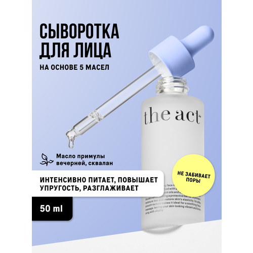Сыворотка для лица The Act интенсивно питает, разглаживает и повышает упругость. Содержит стабильные и успокаивающие масла с выраженным питательным действием: сквалан, масло примулы вечерней, масло ши и конопли. Масло для массажа лица отлично подходит для различных массажных техник и обеспечивает комфортное продолжительное скольжение. Стеклянный флакон с пипеткой позволяет набирать необходимое количество сыворотки. В сочетании с массажем омолаживающее масло улучшает цвет лица, подтягивает и повышает упругость кожи, помогает избавиться от морщин и улучшает рельеф. Подходит для фейсфитнеса, массажа руками и скребком гуаша. Не оставляет пленки и липкости и не провоцирует появление прыщей. Увлажняющее масло примулы вечерней насыщает кожу жирными кислотами и витаминами, питает и восстанавливает ее липидный барьер. Сквалан придает коже шелковистость и гладкость, разглаживает морщины, обеспечивает идеальное скольжение. Витамин Е оказывает регенерирующее, противовоспалительное, нормализующее действия. Масло конопли питает, устраняет отёчность, оказывает противовоспалительное и регенерирующее действия, регулирует работу сальных желез. Масло жожоба и миндаля увлажняют и питают, насыщают кожу ценными витаминами, жирными кислотами, оказывают влагозащитное действие на кожный барьер Сыворотка с натуральной формулой для усиления эффекта массажа лица делает кожу свежей и упругой и помогает избавиться от следов усталости.