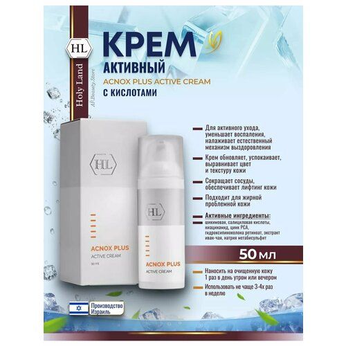Активный крем для лица для выравнивания текстуры и цвета кожи с кислотами и витаминами. Для ухода за проблемной кожей лица специалисты Holy Land рекомендуют активный крем Acnox Plus Active Cream. Средство, рассчитанное на особенности жирной, комбинированной или с признаками угревой болезни кожи, обладает противовоспалительными, успокаивающими, обновляющими качествами.