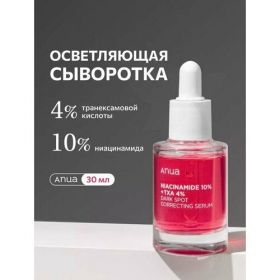 Осветляющая сыворотка с транексамовой кислотой Anua Niacinamide 10% + TXA 4% Serum направлена на коррекцию таких несовершенств, как пигментные и застойные пятна, постакне, тусклый и неоднородный цвет лица, чрезмерная жирность кожи. Продукт замедляет синтез меланоцитов, препятствуя образованию меланина и предупреждая появление гиперпигментации. Значительно улучшает цвет лица, тонизирует и возвращает здоровое сияние. Регулирует работу сальных желёз, делая кожу гладкой и бархатистой. 10 видов гиалуроновой кислоты и церамиды нормализуют гидролипидный баланс и насыщают влагой, защищают от сухости. Основные действующие компоненты:10% ниацинамида (витамин B3) способствует стимуляции синтеза коллагена и улучшению защитных функций, помогает снизить трансэпидермальную потерю влаги и пигментацию, смягчает, повышает эластичность, увлажняет, сужает поры.4% транексамовой кислоты подавляет активность тирозиназы — фермента, который запускает выработку пигмента меланина. Не вызывает фоточувствительности, может использоваться в дневном уходе. Софольянс (фермент Candida Bombicola), оказывает антибактериальное действие и предотвращает рост специфичных бактерий, вызывающих акне. Фермент значительно снижает выработку кожного сала, сокращает число папул и пустул на коже. Снимает раздражение и не нарушает микрофлору.2% арбутина снижают продукцию пигмента меланина, оказывают антисептический эффект, избавляют от отёков и тусклого тона, а также смягчают, кондиционируют и помогают справляться с оксидативным стрессом, замедляя возрастные изменения. Витамин С (3-О-Ethyl Ascorbic Acid) — стабильная форма витамина C. Осветляет пигментные пятна, стимулирует синтез коллагена и оказывает антиоксидантное действие, тем самым повышает упругость и плотность, продлевает молодость кожи. Подходит для нормальной, комбинированной и жирной кожи. Способ применения: нанесите необходимое количество сыворотки на тонизированную кожу, завершите уход кремом. В дневное время обязательно используйте солнцезащитное средство.