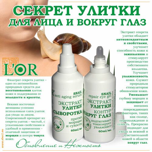 Сыворотка для лица: Фильтрат секрета улитки – одно из активнейших природных средств для восстановления клеток кожи и поддержания ее молодости и красоты. Совокупность биоактивных свойств, минерального и органического состава создают сильнейший косметический комплекс. Веками восточные женщины успешно использовали слизь улиток для ухода за лицом. Современный препарат из секрета улиток – чистый, с усиленными свойствами и удобный в применении – отличный защитник от морщин и потери тонуса кожи.