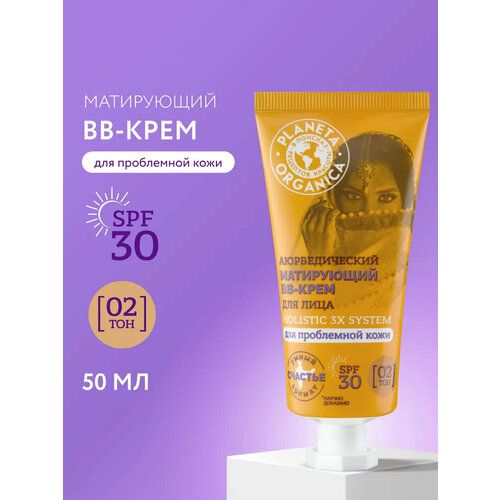 Аюрведический матирующий BB-крем SPF30 для проблемной кожи Planeta Organica Holistic 3x system bb cream, тон 02, темный оттенок, 50 мл. Тональное средство скрывает покраснения и воспаления, а также матирует и защищает от UV-излучения.