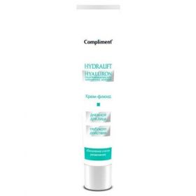 Compliment Hydralift Hyaluron Крем-флюид Для Лица Глубокого Действия Дневной 50мл. Состав: гиалуроновая кислота. Показания: для лица. Действие: Обновление клеток, увлажнение. COMPLIMENT HYDRALIFT HYALURON крем-флюид для лица глубокого действия дневной 50МЛКосметические средства на основе гиалуроновой кислоты - современный способ омоложения кожи. Благодаря своей исключительной способности удерживать в большом количестве водугиалуроновая кислота выполняет важнейшую роль в обеспечении оптимального уровня увлажненности тканей кожи. Также она участвует в регенерации тканей, позволяя сохранять поверхность кожи гладкой и подтянутой. Гиалуроновая кислота - это один из важнейших строительных материалов кожи, обеспечивающий увлажнение, упругость и эластичность. Формула дневного крема основана на DUO-HYALURON COMPLEX, сочетающего в себе силу двух видов гиалуроновой кислоты - высокомолекулярной и низкомолекулярной: - высокомолекулярная гиалуроновая кислота обладает интенсивным увлажняющим действием, она образует устойчивую гелевую сетку, которая разглаживает поверхность кожи сразу после нанесения; - низкомолекулярная гиалуроновая кислота глубоко проникает в кожу, помогает улучшить упругость и уменьшить глубокие морщины, обеспечивая коже молодой и сияющий вид. Комплексная система воздействия способствует поддержке долговременной выработки гиалуроновой кислоты, придавая подтянутый контур лица, устраняя морщины, активируя процессы омоложения, обеспечивая восстановление тургора и эластичности кожи. Происходит усиление и пролонгация действия косметологических процедур (пилинг, очищение, питание и регенерация кожи). Подтягивающий крем на основе чистой гиалуроновой кислоты разработан специально для интенсивного питания и омоложения кожи лица. Средство обеспечивает мгновенное увлажнение и лифтинг поверхностных слоев эпидермиса, восстановление водно-электролитного баланса кожи на клеточном уровне и заметную редукцию глубоких морщин. Крем образует на поверхности кожи невидимую воздухопроницаемую пленку - слой с гиалуроновой кислотой, который стимулирует активность фибропластов, препятствует потере жизненно важной влаги и защищает от негативных факторов окружающей среды. Этот компонент помогает снизить скорость испарения воды, позволяя ей активно питать кожу, делая ее ровной и гладкой. Оливковое масло в составе крема интенсивно смягчает глубокие слои эпидермиса, а термальная вода устраняет покраснения, раздражение, ощущение дискомфорта, усиливает естественные защитные свойства кожи. Легкая текстура крема легко наносится, не оставляет жирного блеска и является прекрасной основой под дневной макияж. Комплекс UV фильтров защищает кожу от вредных ультрафиолетовых лучей. Уже после первого применения лицо выглядит свежим и отдохнувшим, восстановленные клетки кожи вновь обретают эластичность и упругость. Регулярное ежедневное использование средства способствует пролонгированному эффекту. наносить мягкими массирующими движениями каждое утро на очищенную кожу лица и шеи, избегая области вокруг глаз.