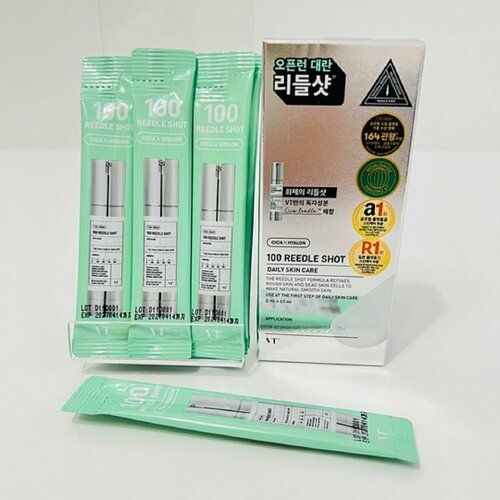 Vt Инновационное средство против морщин (тревел 2мл х10шт) Reedle Shot 100-уникальная эссенция, которая содержит мощные ингредиенты в форме микроигл, с микро-размером меньше пор. Эти активные компоненты имеют форму микроигл и обладают глубоким проникновением в слои эпидермиса. Средство имеет 100% степень удовлетворенности количеством впитывания кожи, глубиной впитывания, улучшением скорости впитывания и улучшением текстуры кожи. Увлажняющий состав быстро впитывается, и значительно улучшает текстуру кожи. Эссенция вызывает ощущение покалывания, которое является естественным и уникальным для продукта, возникает в процессе поглощения питательных веществ. Средство прошло все клинические испытания на раздражение кожи и имеет результаты 0% на кожную реакцию. Эссенция рекомендуется для уставшей, зрелой кожи, нуждающейся в правильном уходе за счет глубокого проникновения активных ингредиентов. Согласно испытаниям и отзывам, в результате использования через три дня кожа становится значительно плотнее, более блестящей и гладкой, эластичной и увлажнённой. Средство быстро впитывается в тусклую кожу, с глубоким всасыванием, что значительно улучшает ее состояние. Люди принимавшие участие в тестировании 100% заявили, что продукт является эффективным и готовы рекомендовать его, и совершить повторную покупку. Линейка REEDLE SHOTсочетает в себе CICA-комплекс и запатентованный ингредиент в форме микроигл для эффективной доставки ингредиентов в самые глубокие слои кожи. Эссенция нагревает очищенные ингредиенты микроигольчатого типа и ингредиенты Cica вместе- в вакууме, в то время как ингредиенты Cica впитываются через мелкие поры и пустые пространства. Ингредиенты Cica Reedle в Reedle Shot меняют цвет на светло-коричневый после очистки, поскольку в них добавлен процесс пропитки экстракта центеллы азиатской, который является запатентованной формулой VT. DEEP, который был доказан клиническими испытаниями, улучшает текстуру кожи за счет увеличения глубины, количества и скорости впитывания. Способ применения: Использовать вечером, на чистое лицо нанести необходимое количество средства и аккуратно помассировать подушечками пальцев. Reedle Shot 100 можно использовать ежедневно. Не рекомендуется тереть, сверху можно нанести крем. Состав: Азиатикозид - натуральный успокаивающий и регенерирующий компонент, производный от центеллы азиатской. Стимулирует синтез коллагена и эластина. Мадекассосид - производный центеллы, обладает сильными антиоксидантными свойствами. Мадекассовая кислота - снимает раздражение, регенерирует и заживляет кожу, снимает отеки. Азиатиковая кислота - разновидность экстракта центеллы азиатской, обладает уникальными свойствами. Помогает восстановить защитный барьер после косметологических процедуру. Заживляет следы от пост-акне. Лизин-аминокислота, участвующая в восстановлении тканей и формировании коллагена. Аргинин - аминокислота, влияющая на микроциркуляцию и защитную функцию кожи. Серин - аминокислота, имеющая иммуномодулирующее действие, улучшающая структуру кожи. Аспарагиновая кислота - натуральный ингредиент, помогает уменьшит возрастные пигментные пятна и приостанавливает их появление. Аланин - алифатическая аминокислота, важный источник энергии для мышечных тканей, укрепляет иммунную систему, нормализует физиологическое сос