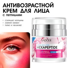 Крем для лица, шеи и декольте Sadoer Hexapeptide Firming Neck Cream - ваше секретное средство для омоложения и поддержания упругости кожи. Это средство антивозрастного ухода помогает бороться с признаками старения, эффективно подтягивает кожу, интенсивно увлажняет, уменьшает глубину морщин и блокирует появление новых. Крем помогает достичь видимых результатов благодаря своей уникальной формуле. Продукт содержит гексапептид-8, который разглаживает морщины и "кольца Венеры", визуально улучшает состояние кожи. Его состав также усилен ретинолом и коллагеном. Они повышают упругость и эластичность кожи, тормозят старение, оказывают лифтинг-эффект, защищают от дряблости и провисания. Гиалуроновая кислота 3% интенсивно увлажняет кожу, поддерживая необходимый уровень влаги в эпидермисе. Сок листьев алоэ снимает раздражения и покраснения, успокаивает кожу, дарит ей здоровый ровный тон. Китайская косметика известна своими высококачественными ингредиентами, что гарантирует эффективный уход за кожей. Уникальная ваакумная упаковка лучше сохраняет качество продукта, предотвращая его окисление и деградацию активных веществ. Продукт подходит для ежедневного применения.