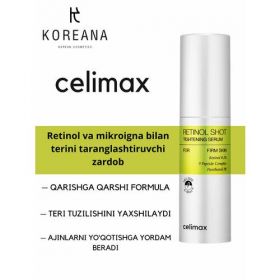 Cыворотка с ретинолом и микроиглами Celimax The Vita-A Retinol Shot Tightening Serum — это высокоэффективное антивозрастная сыворотка, разработанное для улучшения упругости кожи, уменьшения морщин и сужения пор. Сыворотка содержит 0,1% чистого ретинола, инкапсулированного в липосомы для глубокого проникновения в кожу. Технология A-Shot™ использует 162 000 микроскопических спикул из морской губки, которые усиливают доставку активных компонентов, стимулируют обновление клеток и повышают эффективность средства.