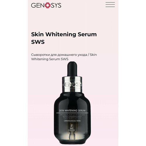 Сыворотка осветляющая для борьбы с пигментацией GENOSYS Skin Whitening Serum SWS выравнивает тон кожи, устраняет нарушения пигментации, предотвращает появление новых пигментных пятен. Увлажняет, восстанавливает, оказывает антиоксидантное, регенерирующее и разглаживающее действие.