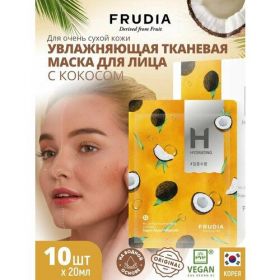 Тканевые маски Фрудиа - это экспресс-уход за кожей. Они интенсивно увлажняют и питают кожу, осветляют, повышают упругость и эластичность, успокаивают, устраняют воспаления. Каждая маска направлена на решение определенной проблемы, имеет удобное лекало и концентрированную пропитку на водной или кремовой основе. Особая технология экстракции позволяет получать питательные вещества из фруктов максимально бережно. Сбалансированная формула удерживает влагу в коже в течение длительного времени. Тонкое и воздушное полотно позволяет маске наиболее плотно прилегать к коже без чувства липкости и тяжести. Увлажняющая маска с кокосом оказывает глубокое увлажняющее и смягчающее действие. Цитоксины в составе кокосовой воды продлевают молодость кожи, а гиалуроновая кислота защищает от обезвоженности