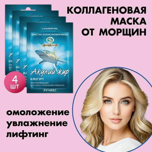 НАЙТИ ВЫГОДНЕЕ - Акулья сила. Эластин-коллагеновая маска для лица, от морщин, от признаков старения кожи, омолаживающая. Акулий жир и йогурт. Набор 4 шт. по 12мл / лучикс