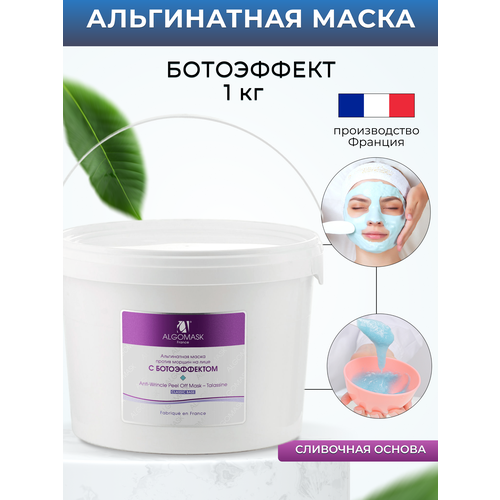 Альгинатная маска профессиональная для лица с ботоэффектом Algomask против морщин с миорелаксантом Аргирелин. Предупреждает раннее старение кожи, активизирует обменные процессы. Аргирелин, входящий в состав, обладает действием, аналогичным инъекции ботокса, — мягко расслабляет мышцы, разглаживая и уменьшает глубину мимических морщин под глазами, около рта, на лбу, в уголках глаз («гусиные лапки»), улучшает общий тонус кожи, укрепляет коллагеновые волокна. Водоросль Lola Implexa освобождает клетки от токсинов и шлаков, обогащает кислородом, увлажняет, питает, освежает и выравнивает цвет лица, улучшает синтез коллагена. Кожа насыщается полезными микроэлементами, повышается упругость и эластичность. Подходит для всех типов кожи, особенно для увядающей, зрелой кожи. Альгинат производится в лабораториях Франции по уникальным формулам из морских водорослей пролива Ла -манш. Уникальные рецептуры, основанные на натуральных компонентах, дополняются инновационными разработками в области косметологии. В составе косметики нет нефтехимических производных, ингредиентов животного происхождения, минеральных масел и веществ, оказывающих токсичное воздействие на кожу, не разбавлен другими примесями, ухудшающими качество. Используется в области носа, губ, шеи, в зоне декольте, подбородка, бровей, вокруг глаз и век. Альгинатные маски по эффективности превосходят пузырьковые, тканевые, гидрогелевые и глиняные за счет того, что создают парниковый эффект. Все активные ингредиенты, в составе, удерживаются под слоем, а не испаряются. Рекомендуется проводить курсом или как экспресс маску перед важным мероприятием. Регулярное использование усилят защитные функции кожи. Обладают мощными увлажняющими свойствами. Стимулируется приток минеральных веществ из состава маски в кожу, связывают и выводят из организма радионуклиды, соли тяжёлых металлов. Действие масок Algomask настолько быстрое, что результат виден уже после первого применения. Особенно рекомендуется использовать во время активного солнца и отопительного сезона для быстрого восстановления кожи. Косметический продукт усиливает действия сывороток, которые наносятся под маску и обеспечивает глубокое проникновение в эпидермис активных компонентов. Перед применением необходимо очистить кожу, использовать гель для очищения или пенку для умывания. Также рекомендуем сделать легкий массаж лица, чтобы усилить приток полезных микроэлементов в глубокие слои кожи. Маску также используют после любых аппаратных или механических процедур, узи чистки лица и пилинга. Для разведения косметической смеси эффективнее применить сыворотку-активатор для разведения альгинатных масок вместо воды, так результат будет ярче и продолжительнее. После снятия нанести легкий крем.