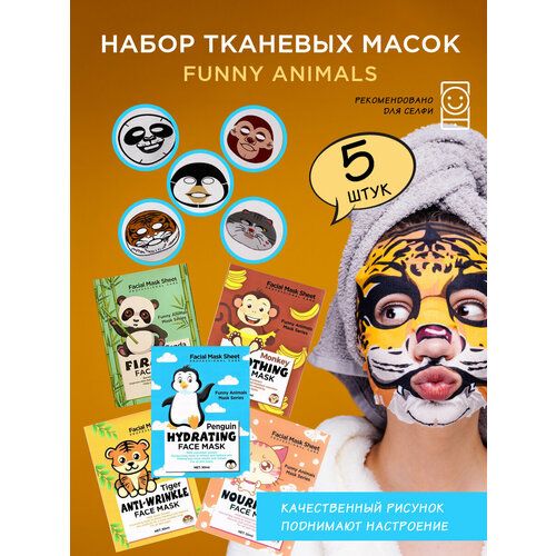 НАЙТИ ВЫГОДНЕЕ - Тканевая маска для лица с животными Funny Animals, набор масок для лица подарочный 5 штук