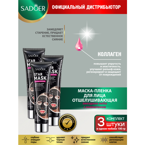 Отшелушивающая маска-пленка для лица Sadoer звездное небо с коллагеном 100 гр. х 3 шт. Отшелушивающая маска-пленка для лица с коллагеном помогает освежить, очистить и улучшить состояние кожи лица. Коллаген обладает увлажняющим, питательным и омолаживающим эффектом, помогает укрепить эластичность кожи, улучшить ее текстуру и тонус, а также способствует сокращению морщин и мелких морщин. Маска с легкостью наносится на кожу, образуя тонкую, плотную пленку, которая глубоко проникает в поры, вытягивая черные точки и излишки себума.