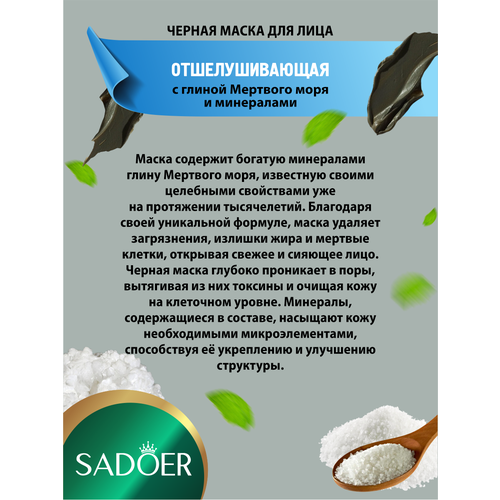 Отшелушивающая черная маска для лица Sadoer с глиной Мертвого моря и минералами 100гр х 2шт. Маска обладает мощным действием, которое поможет вам достичь идеально чистой и сияющей кожи. Глина Мертвого моря, богатая минералами, глубоко проникает в поры и удаляет излишки кожного жира, пыль и другие загрязнения, которые могут привести к появлению черных точек, стимулирует кровообращение и улучшает обменные процессы в коже, что способствует ее омоложению и улучшению цвета. Отшелушивающие частицы мягко и эффективно удаляют ороговевшие клетки кожи, делая ее более гладкой и мягкой на ощупь. Регулярное использование маски поможет избавиться от шероховатостей и неровностей кожи, придавая ей здоровый и ухоженный вид. Маска обладает противовоспалительным и успокаивающим действием, что делает ее идеальным средством для проблемной кожи. Она поможет справиться с раздражениями, воспалениями и покраснениями, оставляя кожу чистой и свежей.