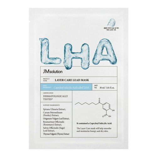 Обновляющая маска для чувствительной кожи JMsolution Layer Care Lead Mask деликатно отшелушивает и полирует поверхность эпидермиса, удаляет омертвевшие клетки кожи и смягчает огрубевшие участки. Она интенсивно увлажняет, повышая проницаемость тканей, и стимулирует процессы обновления клеток. Ключевой актив продукта — LHA-кислота (каприлоил салициловая кислота), которая является мягким аналогом салициловой BHA-кислоты. Она имеет более крупные молекулы в отличие от салициловой кислоты, что делает ее работу более медленной и мягкой.