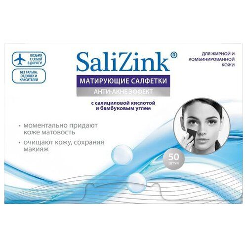 Salizink салфетки матирующие с салициловой кислотой и бамбуковым углем для жирной и комбинированной кожи описание матирующие салфетки моментально придают коже матовость, эффективно впитывают пот и жир на лице; очищают кожу, сохраняя макияж. Бамбуковый уголь отлично адсорбирует частицы пыли и загрязнений, а также токсины на поверхности кожи. Салициловая кислота оказывает бактерицидное и противовоспалительное действия, уменьшая количество высыпаний. - моментально придают коже матовость, очищают кожу, сохраняя макияж, удобно использовать в путешествии; - салициловая кислота, бамбуковый уголь, без талька, красителей и отдушек. Способ применения откройте упаковку, возьмите салфетку и аккуратно промокните ею лицо. Используйте новую салфетку каждый раз. Инфографика - если есть возможность. Меры предосторожности применяйте только для очистки кожи. Подходит для ежедневного применения. Храните в недоступном для детей месте. Возможна индивидуальная непереносимость