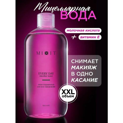 Миксит Мицеллярная вода для очищения кожи лица и снятия макияжа Your Skin Micellar Water. Большой объем – 500 мл. Уходовое средство нежно очищает кожу лица и зону вокруг глаз, не вызывая покраснение и раздражение. Делает кожу упругой и эластичной, способствует устранению жирного блеска. Также очищающая жидкость направлена на интенсивное увлажнение, устранение шелушений и смягчение. Раствор для демакияжа с натуральным составом без силиконов.