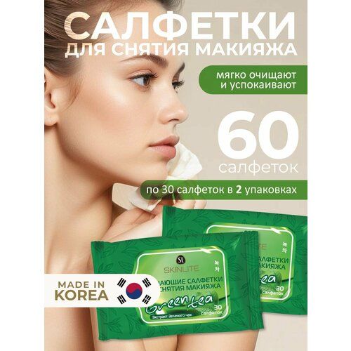 НАЙТИ ВЫГОДНЕЕ - SKINLITE Салфетки для снятия макияжа Зеленый чай, 60 шт
