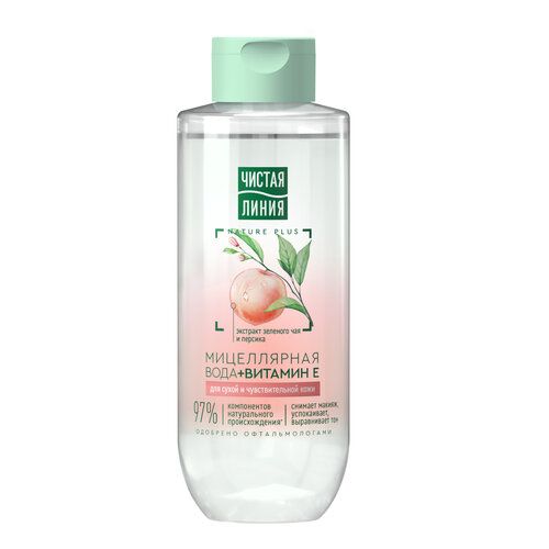 Вода мицеллярная для снятия макияжа с витамином Е содержит эссенцию 5 экстрактов и масел NATURE PLUS (экстракты вербены и пиона, масла льна, миндаля и оливы). Мицеллярная вода для снятия макияжа освежает тон кожи, успокаивает ее**. «Мицеллярка» для очищения лица подойдет для ухода за сухой и чувствительной кожей. Мицеллярная вода гипоаллергенная с витамином Е оказывает антиоксидантное действие, избавляет от тусклости. Мицеллярная вода для снятия макияжа с глаз и лица Чистая Линия питает и увлажняет сухую и чувствительную кожу. Мицеллярная вода Чистая Линия 400 мл с экстрактами персика и зеленого чая освежает тон кожи, бережно ухаживает за ней. Мицеллярная вода с витамином Е успокаивает кожу. Средство имеет нейтральный рН слезы. Чистая Линия мицеллярная вода – это гипоаллергенная уходовая косметика, одобренная’ дерматологами и офтальмологами. «Мицелярка» для лица для снятия макияжа Чистая Линия не содержит отдушек.