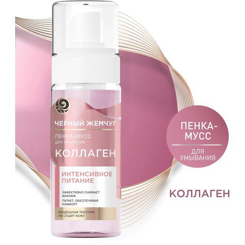 Черный Жемчуг пенка-мусс для умывания Питание с коллагеном создана специально для бережного ухода за чувствительной и сухой кожей. Средство эффективно удаляет даже водостойкий макияж, не сушит и интенсивно питает кожу, оставляя ощущение свежести и комфорта. Пенка для снятия макияжа входит в линейку средств по борьбе с первыми возрастными изменениями.