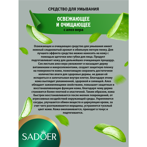 Освежающее и очищающее средство для умывания Sadoer с соком алоэ вера 100 гр. х 3 шт. Освежающее и очищающее средство для умывания имеет нежный сладковатый аромат и обильную легкую пенку. Для лучшего эффекта средство можно наносить на кожу с помощью щеточки или губки для лица. Пенка подготавливает кожу для дальнейших очищающих процедур. Сок листьев алоэ вера увлажняет и насыщает кожу витаминами и микроэлементами, создает защитную пленку на поверхности кожи, помогающую сохранить достаточное количество влаги для здоровья кожи, не давая ей испариться и запечатывая внутри клеток. Благодаря этому кожа выглядит увлажненной, здоровой и сияющей. Алоэ обладает заживляющими свойствами, повышает защитные и восстанавливающие функции кожи, благодаря чему кожастановится более плотной и эластичной. Таким образом, кожа быстрее восстанавливается после мелких повреждений, от агрессивных воздействий окружающей среды. Укрепляются сосуды, улучшается обмен веществ и циркуляция крови, за счет чего разглаживаются морщины, устраняется тусклый цвет кожи. Кожа омолаживается, приходит в тонус и подтягивается. Способ применения: 1. Используйте утром и вечером. 2. Нанесите небольшое количество продукта на руки, добавьте воды, вспеньте. 3. Распределите по лицу массажными движениями, затем смойте водой.