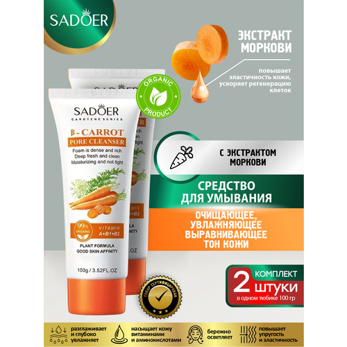 Очищающее, увлажняющее, выравнивающее тон кожи средство для умывания Sadoer 100 гр. х 2 шт. Очищающее средство для умывания имеет нежную текстуру и приятный свежий аромат, экономично в использовании, не оставляет после применения чувства стянутости и дискомфорта. Средство глубоко увлажняет и насыщает кожу необходимыми витаминами и аминокислотами. Экстракт моркови обладает антиоксидантными свойствами, нейтрализует действие свободных радикалов, разрушающих коллагеновые волокна. Благодаря этому, восстанавливается выработка естественного коллагена, ускоряется регенерация клеток, что способствует омоложению кожи, разглаживаются морщины, повышается эластичность и упругость дермы. За счет этого повышаются восстанавливающие свойства кожи, что помогает тканям быстро заживать после полученных повреждений, механических или полученных в результате воздействий факторов окружающей среды. Экстракт моркови бережно осветляет кожу, устраняя пигментные пятна, веснушки, помогает избавиться от отеков. После применения клинсера выровняется тон и микрорельеф кожи, исчезнут отеки, улучшится цвет лица. Кожа станет сияющей и Способ применения: Нанесите необходимое количество средства на ладонь, добавьте воду и аккуратно вотрите в густую пену, слегка помассируйте лицо круговыми движениями в течение некоторого времени, а затем смойте водой.