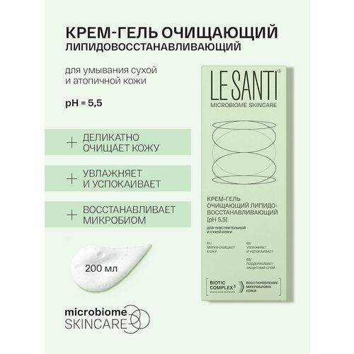 Крем-гель очищающий липидовосстанавливающий LE SANTI MICROBIOME SKINCARE разработан специально для бережного очищения сухой, очень сухой, атопичной и чувствительной и обезвоженной кожи лица и тела. Он мягко очищает, не повреждая липидную мантию кожи без чувства стянутости и сухости, успокаивает кожу, снимает зуд. Дополнительно образует липидный защитный слой, дающий ощущение комфорта и увлажненности после использования. Восстанавливает эпидермальные липиды кожи, усиливает ее барьерную функцию. Гипоаллергенный атопик - гель является эффективным косметическим средством, как молодой, так и проблемной и возрастной коже. Универсальное средство принесет пользу склонной к атопии детской коже, его можно использовать как детский гель для душа, подойдет как для младенцев с рождения (с 0+ лет), так и для юных девочек и мальчиков, для девушек и парней - подростков, женщин и мужчин. Гель для умывания может использоваться для ежедневного очищения кожи. Пантенол обладает регенерирующим и смягчающим действием, питает кожу, быстро снимает раздражение, увеличивает прочность коллагеновых волокон. Комплекс липидов и витамина F образует защитный слой на коже, обеспечивает поддержание оптимального водного баланса и уменьшает воспаление и раздражение. Увлажняющий комплекс из молочной кислоты и глицерина увлажняет и регулирует pH кожи. Аптечная косметика эффективна против шелушения, обеспечивает проблемной коже нежный комплексный уход. Подходит для взрослых и детей с 0 лет. НЕ содержит парабенов, красителей И этилового спирта.