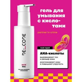 Если вы используете умывалки для лица в ежедневном уходе, то гель для умывания с кислотами имеет все шансы стать вашей любимой умывашкой AHA кислоты в составе очищающего геля позволяют объединить в одном флаконе гель для выравнивания тона, средство для умывания и защиту от постакне. Ключевой активный комплекс работает на очищение лица и сужение пор, помогает от чёрных точек. Задача продукта — деликатное очищение и мягкое отшелушивание, первый шаг в борьбе с гиперкератозом. Походит для лица и тела. АРФ-кислоты отшелушивают и обновляют, выравнивают тон и рельеф, стимулируют синтез коллагена и повышают упругость. Пантенол восстанавливает защитный барьер. Коллекция средств из линейки Acid Key от DE_CODE — решение для деликатного отшелушивания и обновления, ключ к ровному тону кожи.