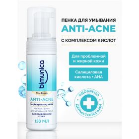 Bimunica Мягкая пенка для умывания лица с комплексом кислот для проблемной кожи Anti-acne, 150 мл - это средство ухода за жирной и проблемной кожей, разработанное с учётом её особенностей. Пенка мягко очищает и увлажняет кожу, удаляя загрязнения и остатки макияжа, предотвращая ощущение сухости и стянутости. Формула помогает выравнивать текстуру кожи, бороться с высыпаниями и улучшать тон.