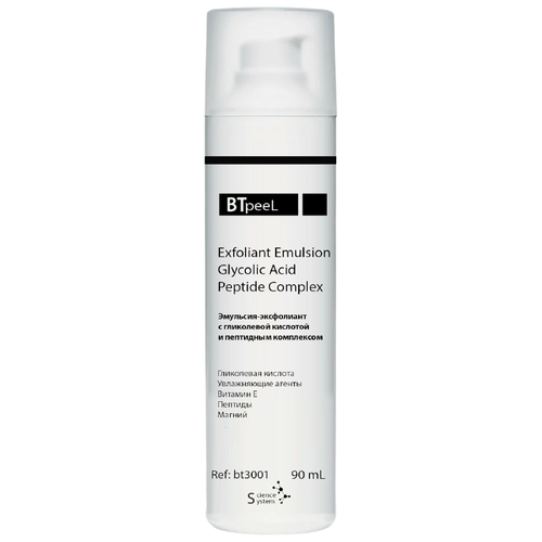 Нежная эмульсия обеспечивает бережную эксфолиацию, омоложение и разглаживание кожи. Эмульсия мгновенно увлажняет кожу, разглаживает морщинки и придаёт коже ухоженный вид. Кожа становится мягкой и эластичной, уменьшается пигментация, выравнивается цвет лица. Эмульсия-эксфолиант устраняет воспалительные элементы, мгновенно впитывается, не оставляя липкости и жирного блеска. Эмульсию-эксфолиант с гликолевой кислотой и пептидным комплексом BTpeel можно использовать в качестве подготовительного средства к хим. пилингам, а так-же для пролонгации действия хим. пилингов. Удобный дозатор обеспечивает комфортное нанесение. Средство дерматологически протестировано и сертифицировано. Не содержит парабенов и отдушек.