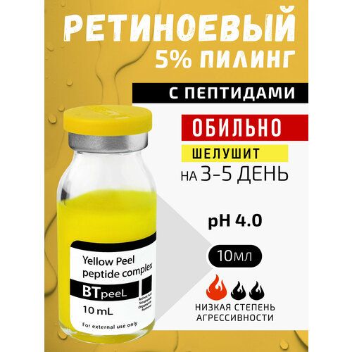 Жёлтый пилинг ретиноевый с пептидным комплексом и пантенолом BTpeel разработан для кожи с признаками увядания, а так-же для молодой кожи в качестве профилактики возрастных изменений. Жёлтый пилинг стимулирует митотическую активность кератиноцитов базального слоя, стимулирует синтез липидов эпидермиса, стимулирует ангиогенез, индуцирует синтез основных функциональных компонентов матрикса дермы, стимулирует выработку коллагена, нормализует процессы дифференцировки и кератинизации в эпидермисе, подавляет синтез меланина. Концентрация ретиноевой кислоты в пилинге 5% - обеспечивает кислоты в препарате не вызывает коагуляции белковых структур при сохранении выраженных эстетических свойств. Влияние основного агента на рецепторы основных функциональных структур эпидермиса и дермы обеспечивает эффект регенерации кожи, приводит в норму деятельность сальных желез. Пилинг обогащён омолаживающими кожу пептидами и пантенолом.