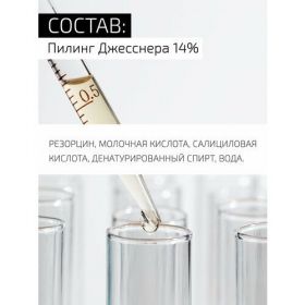 Пилинг Джесснера 14% относится к классическим пилинговым составам. Активность пилинга Джесснера определяется входящими в его состав молочной, салициловой кислотами и резорцином в определённой пропорции. Омолаживает, сокращает морщины, осветляет и очищает кожу с минимальным восстановительным периодом. Молочная кислота в этом составе увлажняет и смягчает кожу. Резорцин является антибактериальным средством, в этом составе он работает как обеззараживающее вещество, плюс к этому он хорошо отслаивает ороговевшие клетки кожи. Салициловая кислота великолепно очищает поры кожи от сальных выделений, очищает стенки протока сальной железы, раздражения и воспаления на коже. Пилинг Джесснера считается универсальным (поверхностно-серединным), глубина проникновения зависит от количества наносимых слоев.
