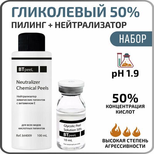 Выгодный набор из химического гликолевого пилинга Гликолевая кислота 50% BTpeel, 10 мл и Нейтрализатор химических пилингов BTpeel, 100 мл.