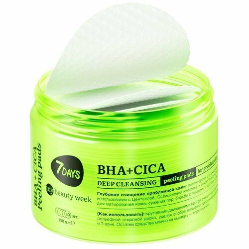 Пилинг для лица, пилинг диски для лица 7DAYS MY BEAUTY WEEK с BHA-кислотами, от прыщей, угревой сыпи, от черных точек и постакне. В упаковке 50 штук + пинцет в комплекте. Пилинг пэды предназначены для моментального очищения, выравнивания кожи и нормализации выработки избыточного себума. Рекомендованы для ежедневного применения в любом возрасте 12+ для всех типов кожи. Результат: чистая кожа, сужение пор и матирование за 1 минуту.