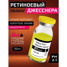 Жёлтый пилинг ретиноевый джесснер BTpeel разработан для кожи с признаками увядания и профилактики возрастных изменений кожи. Жёлтый пилинг стимулирует митотическую активность кератиноцитов базального слоя, стимулирует синтез липидов эпидермиса, стимулирует ангиогенез, индуцирует синтез основных функциональных компонентов матрикса дермы, стимулирует выработку коллагена, нормализует процессы дифференцировки и кератинизации в эпидермисе, подавляет синтез меланина. Концентрация ретиноевой кислоты в пилинге 4% не вызывает коагуляции белковых структур при сохранении выраженных эстетических свойств и даёт мягкое отшелушивание. Влияние основного агента на рецепторы основных функциональных структур эпидермиса и дермы обеспечивает эффект регенерации кожи, приводит в норму деятельность сальных желез.