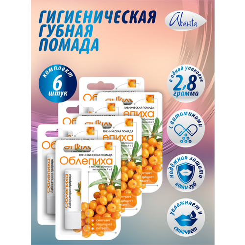 Губная помада Аванта Облепиха 2,8 гр. х 6 шт. Гигиеническая помада с ароматом облепихи – эффективное профилактическое средство по уходу за кожей Ваших губ. Масло облепихи прекрасно питает и смягчает кожу губ, способствует заживлению ранок. Масло какао обладает увлажняющим и смягчающим действием. Комплекс растительных масел и смягчающих добавок оказывает регенерирующее действие, питает кожу губ и предотвращает появление сухости и шелушение. Предназначена для ежедневного мягкого ухода для детей и взрослых в течение всего года.