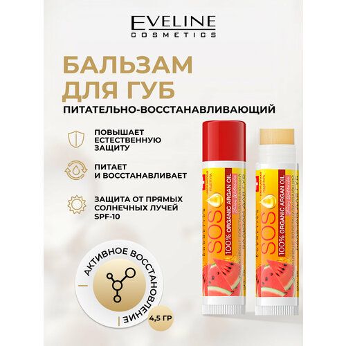 Eveline, Питательно-восстанавливающий бальзам для губ Juicy watermelon серии SOS 100% organic argan oil, 4,5 г. Питательно-восстанавливающий бальзам разработан для ежедневного ухода за очень сухой кожей губ. Инновационная формула, обогащенная передовыми активными компонентами, действующими в синергии с маслом аргана, интенсивно увлажняет, регенерирует и смягчает кожу губ, предотвращая потрескивания и обветривание. Фильтр SPF 15 защищает деликатную кожу губ от вредного воздействия солнечных лучей. Сразу же после использования сухие и потрескавшиеся губы становятся мягкими и гладкими, возвращается ощущение комфорта.