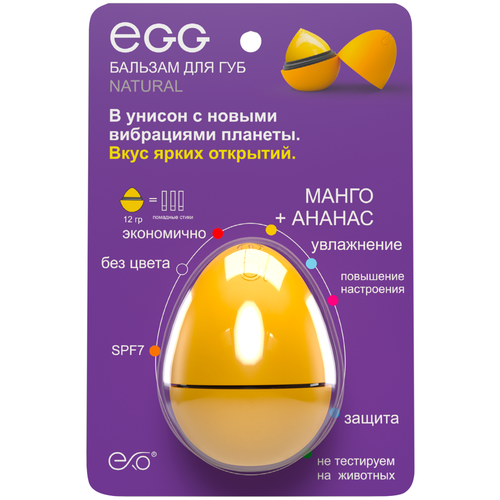 Бальзам для губ EXO Egg "Манго-Ананас" представлен в удобной упаковке из пластика, которая легко помещается в сумку и позволяет легко наносить бальзам одним или двумя касаниями.