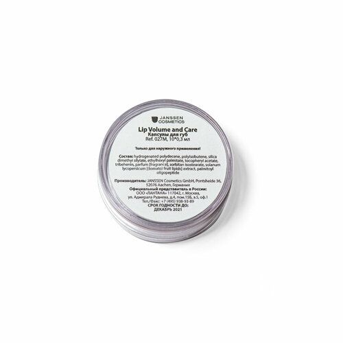 10 капсул позволят Вам попробовать инновационный уход от Janssen Cosmetics. Идеально подходит для отпуска и деловых поездок, так как дает возможность точно рассчитать необходимое количество капсул на каждый день. Капсулы придают насыщенность цвета и объем губам. Витамины Е и ликопин защищают губы от агрессии внешней среды. Биологически активные олигопептиды стимулируют синтез коллагена, формируя упругую ткань, фитосквален смягчает кожу, а бисаболол снимает все признаки воспаления.