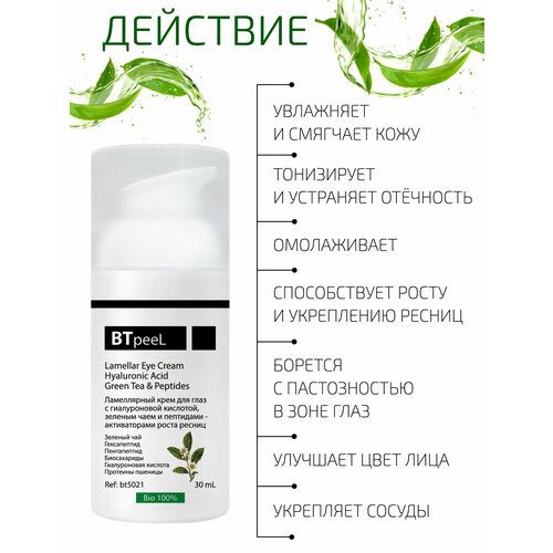 НАЙТИ ВЫГОДНЕЕ - Ламеллярный крем для глаз с гиалуроновой кислотой, зеленым чаем и пептидами - активаторами роста ресниц BTpeel, 30 мл