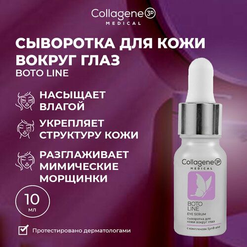 Boto Line сыворотка для коррекции мимических морщин кожи вокруг глаз. Разглаживает мимические морщинки, препятствует образованию новых и уменьшает выраженность глубоких морщин. Укрепляет структуру кожи, насыщает влагой. Коллагеновая сыворотка с гиалуроновой кислотой и пептидным комплексом Syn Ake для век борется с морщинами вокруг глаз, разглаживает носогубные и межбровные морщины. Сыворотка убирает темные круги под глазами и следы усталости. Комплекс активных компонентов глубоко проникает в слои кожи, запускают процессы омоложения и замедляют видимые признаки старения. Пептидный комплекс Syn Ake является альтернативой ботексу и аналогом змеиного яда. Пептид блокирует нервные импульсы и расслабляет мышцы лица. В результате мелкие морщины разглаживаются, а глубокие становятся менее выраженными. Низкомолекулярная гиалуроновая кислота и натуральный коллаген интенсивно увлажняют кожу защищают от потери влаги, укрепляют структуру кожи, стимулируют синтез собственного коллагена, делают кожу упругой и эластичной, способствует обогащению клеток кислородом, помогает исчезновению темных кругов под глазами, устраняет признаки отечности, обеспечивает сияющий взгляд. Применяется в ежедневном уходе.