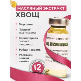 Натуральный органический экстракт Хвоща – это мощное средство для ухода за кожей, которое поможет избавиться от многих проблем, связанных с внешностью. Если вы хотите, чтобы ваша кожа стала более гладкой и упругой, а также убрать отеки, мешки и круги под глазами, то это масло — идеальный выбор для вас. Хвощ полевой - это прекрасный выбор для тех, кто ищет натуральный и эффективный способ избавиться от морщин на веках и лбу, убрать отеки век, дряблость и обвислость кожи. Также оно может использоваться для лечения капиллярных сеточек и звёздочек на лице. Незаменимое средство при абсцессах, лишае, фурункулах, а также при экземе, нейродермите, псориазе и дерматите. Данная медицинская косметика прекрасно подходит для лечения варикоза, варикозного расширения и тромбофлебита глубоких вен, а также для заживления рубцов, шрамов и послеродовых растяжек живота. Она выравнивает подкожный рельеф тканей, оказывает антимикробное, противовоспалительное, восстанавливающее и заживляющее действие на раны. Мазь эффективно снимает отечность рук, ног, синяки и ушибы. Если у вас есть проблемы с грибком ногтей, то это средство стоп-грибок - противогрибковый крем, который может помочь вам избавиться от этой неприятной проблемы. Для всех, кто мечтает об укреплении и увлажнении своих ногтей, масло поможет ускорить рост и укрепить ногтевую пластину. Он может быть использован в качестве природного жиросжигателя, против целлюлита, как массажное антицеллюлитное масло, для похудения тела и сжигания жира. Вы можете использовать его как крем для занятий фитнесом, так и в сочетании с другими косметическими средствами для улучшения эффективности вашей диеты и оказания дополнительной помощи в борьбе с целлюлитом. Если вас беспокоят возрастные изменения или вы хотите увеличить упругость своей груди, это масло вам поможет. При дряблости кожи, морщинах, отеках лица, капиллярной сетке: пользоваться как кремом 1-2 раза в день. При дряблости кожи дополнительно рекомендуется массаж лица. При возрастных изменениях упругости груди: нанести тонким слоем и делать массаж круговыми движениями по часовой стрелке, затем против часовой стрелки, повторять 10 раз по 3 подхода. При отечности ног, синяках, ушибах ставить аппликации на 20 минут 1-2 раза в день. При ногтевом грибке: смочить ватный диск в экстракте, наложить на каждый ноготь на 20 минут, мазь предотвращает ломкость ногтевой пластины, укрепляя её. Возможна индивидуальная непереносимость.
