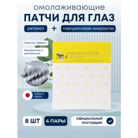 Патчи Spa Treatment i Micro Patch Re: ti PATCH сочетают в себе передовые технологии и высокоэффективные ингредиенты, обеспечивающие интенсивный уход за кожей и быстрый видимый результат. В состав патчей входят три активные компонента, которые работают синергетически: Ретинол (чистый витамин А) проникает в кожу и преобразуется в ретиноевую кислоту, которая взаимодействует с клетками на молекулярном уровне. Она ускоряет регенерацию клеток кожи, способствуя обновлению эпидермиса, а также увеличивает выработку коллагена и эластина. Ретинол улучшает текстуру кожи, делая ее более гладкой и упругой, разглаживает морщины, устраняет тусклость, помогает устранить повреждения от ультрафиолетовых лучей и свободных радикалов. Syn Ake - синтетический пептид, разработанный на основе структуры токсина змеиного яда, который блокирует нервные сигналы, вызывающие мышечные сокращения, что помогает расслабить мышцы лица и уменьшить появление мимических морщин. Syn Ake уменьшает глубокие заломы, улучшает общий тонус кожи и обеспечивает видимый эффект лифтинга. Гидролизованная гиалуроновая кислота проникает глубоко в кожу, обеспечивая интенсивное и длительное увлажнение, улучшает эластичность тканей. Патчи Spa Treatment i Micro Patch Re: ti PATCH стимулируют клеточное обновление, разглаживают морщины и обеспечивают глубокое увлажнение. Наноиглы, длиной 250 микрометров, созданы по уникальной запатентованной технологии, позволяющей гиалуроновой кислоте проникать под роговой слой и растворяться непосредственно в глубоких слоях эпидермиса. Благодаря чему кожа становится более увлажненной, гладкой, упругой, уменьшается глубина морщин и обеспечивается выраженный омолаживающий эффект. Процессы регенерации кожи, гидродинамики тканей, миграции и пролиферации клеток запускаются сразу после растворения игл. Особенно рекомендовано для работы с проблемными участками вокруг глаз и губ.