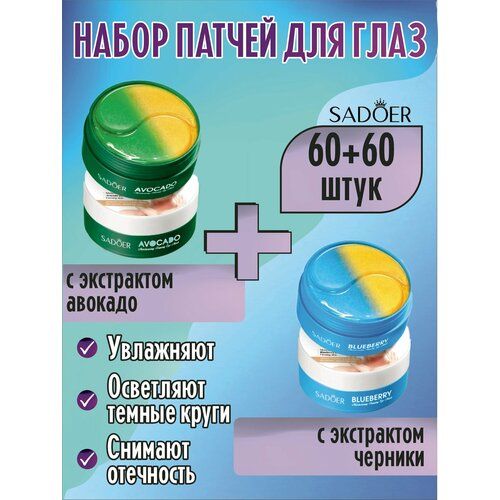 НАЙТИ ВЫГОДНЕЕ - Sadoer. Набор патчей для глаз: С экстрактом Авокадо + С экстрактом Черники, 60 пар