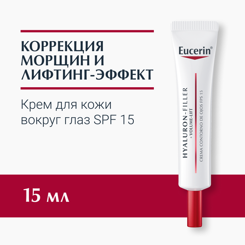Крем для ухода за кожей вокруг глаз Eucerin Hyaluron-Filler + Volume-Lift с SPF 15+ UVA создан для деликатного ухода за нежной кожей вокруг глаз и ее защиты от солнца. Подходит для всех типов кожи. В составе крема для кожи вокруг глаз ― три активных ингредиента, воздействующих на те слои кожи, где происходит потеря объема: - магнолол ― стимулирует выработку клеток кожи, создающих объем, а также увеличивает их размер (исследование in vitro); - олигопептиды ― влияют на выработку коллагена, повышая упругость кожи; - гиалуроновая кислота ― способствует увлажнению кожи и разглаживанию даже глубоких морщин. Крем для ухода за кожей вокруг глаз Eucerin Hyaluron-Filler + Volume-Lift также предотвращает фотостарение и углубление вызванных солнцем морщин благодаря SPF 15 и защите от UVA/UVB-излучений. Высокая эффективность продукта и его хорошая переносимость доказаны клиническими и дерматологическими испытаниями. Офтальмологически протестировано: крем вокруг глаз можно использовать при ношении контактных линз. Свойства: - офтальмологически протестирован - подходит для использования с контактными линзами - подходит в качестве основы под макияж - SPF 15 - защита от UVA- и UVB-лучей - без отдушек. Подходит для взрослых с 14 лет.