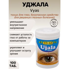 тоник для глаз Уджала в таблетках (Ujala) компании Vyas — это часть аюрведического комплекса препаратов (куда также входят глазные капли) для укрепления глаз и улучшения зрения. Таблетки Уджала – чисто растительное фитосредство, в составе которого 9 лекарственных трав.