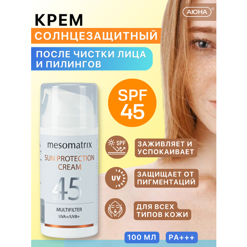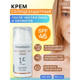 Солнцезащитный крем SUN PROTECTION CREAM SPF 45 от Мезоматрикс (аюна) — профессиональная защита для лица и тела, разработанная специально для кожи после агрессивных процедур: пилингов, лазера, микротоков, аппаратной чистки и других инвазивных воздействий.