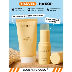 Солнцезащитный набор MIXIT на весну-лето увлажняющий крем-флюид и стик спф для лица обеспечивают надежную защиту от ультрафиолетовых лучей, предотвращая преждевременное старение кожи под воздействием солнца. Этот набор уходовой косметики идеально подходит как для мужчин, так и для женщин всех возрастов. Удобный формат средств позволяет их брать с собой в отпуск, в путешествие, на море или на природу.